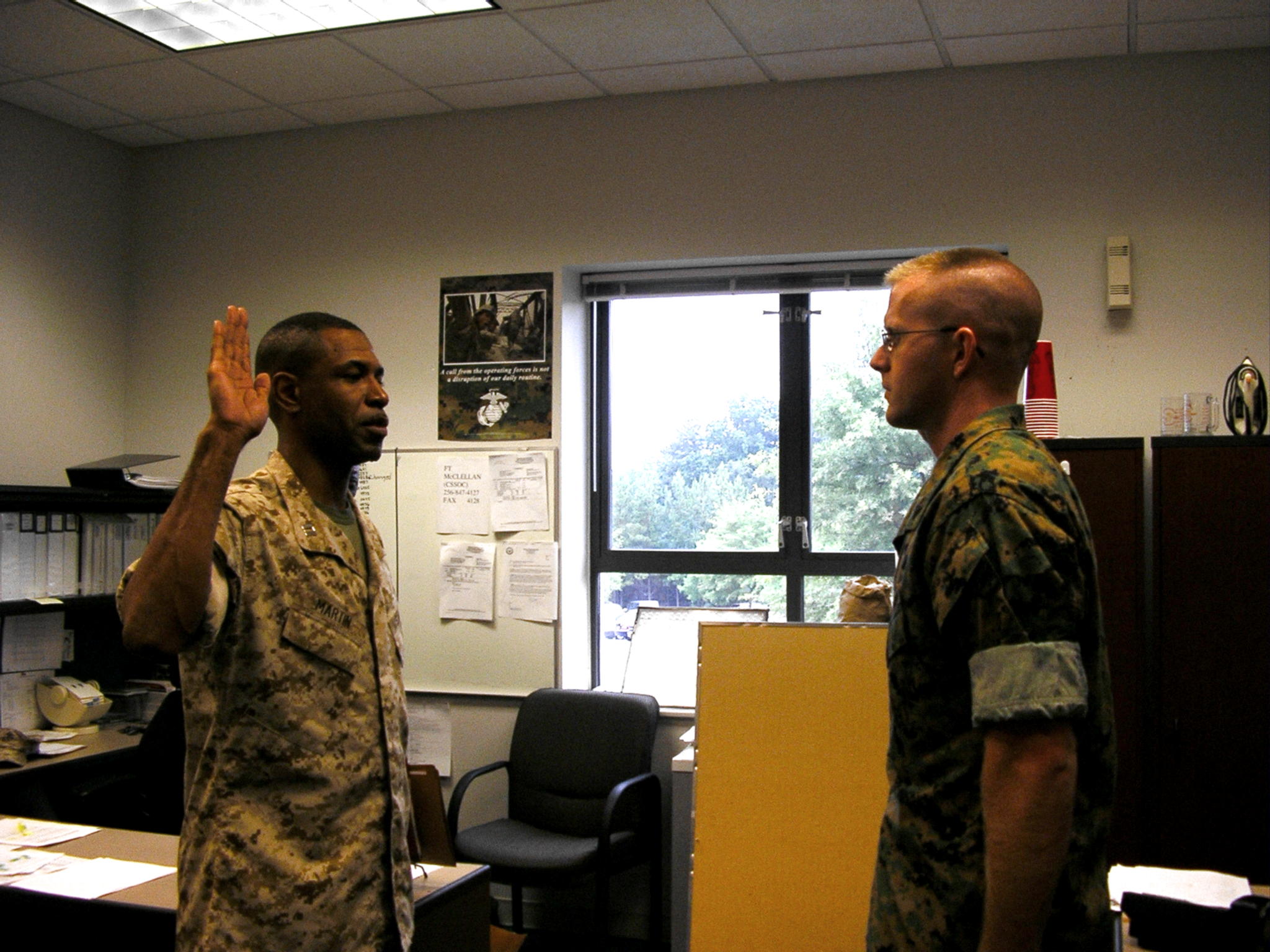 I got off my ass, got back in shape, and got on the phone with the prior service recruiter. Skipping all the sordid details of a paperwork nightmare, a little more than a year later, on July 10, 2005, I stood before a Captain with the 4th FSSG, raised my right hand, and took the oath of enlistment for the second time in my life, sworn-in as a 35 year-old Corporal of Marines (reserve) as my wife and son looked on.